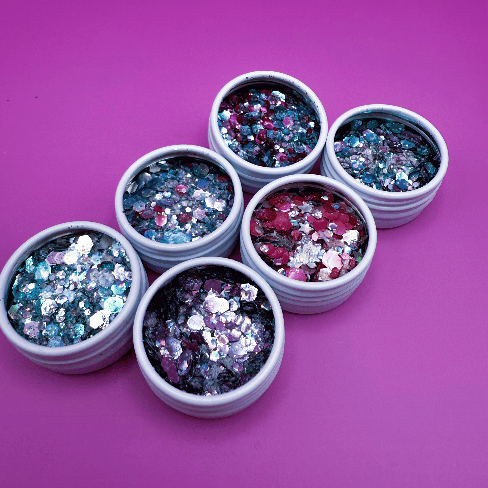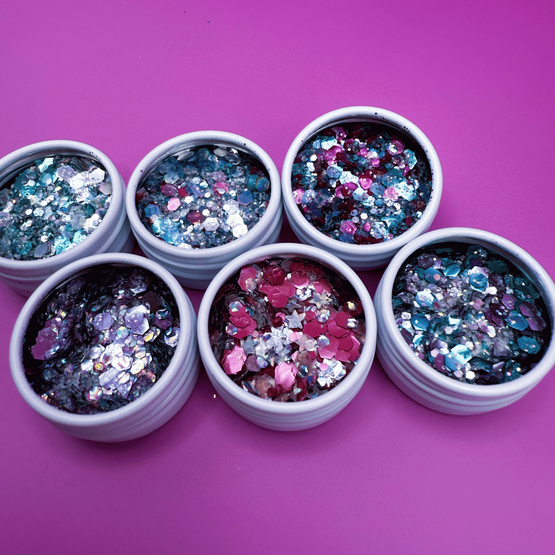Get all 6 of our NEW 2g Loose Chunky Glitter Pots. These pots are packed with a mix of differently sized glitters for maximum sparkle and dimension. Perfect for layering in hair or on your body. This glitter brings creativity and light to every festival or show. Made of cosmetic grade biodegradable glitter and packaged in eco friendly material, this glitter is safe for you and the planet too!